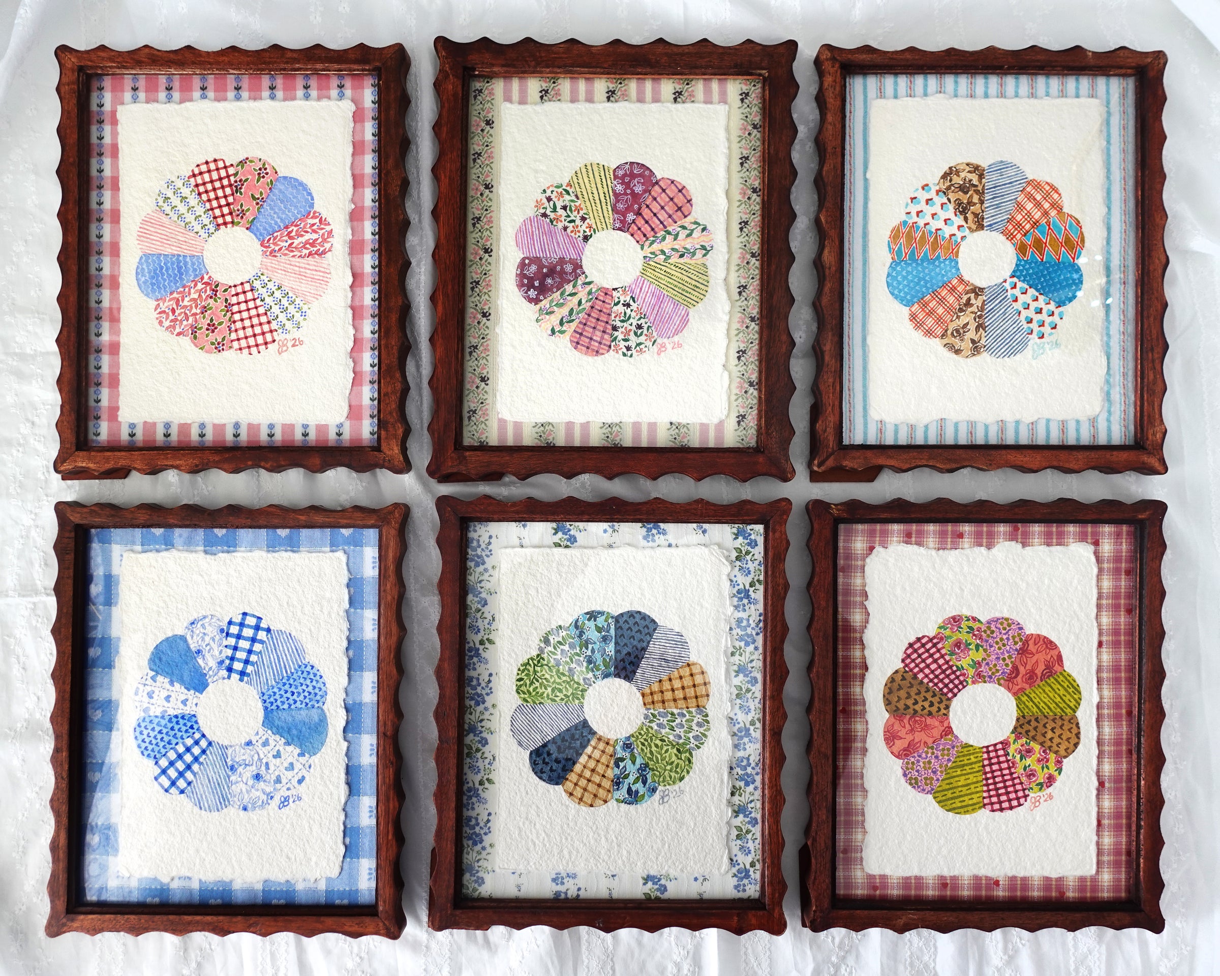 Six, hand-painted framed original watercolor paintings - each a meditation on pattern play
