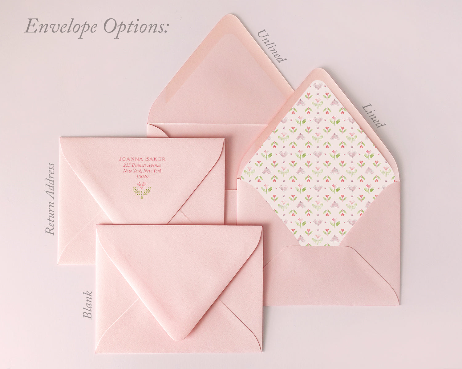 Darling cross stitch motifs have been hand painted and turned into sweet, personalized notecards. Paired with ballet pink euro flap envelopes. Upgrade your envelopes with an optional liner and return address printing.