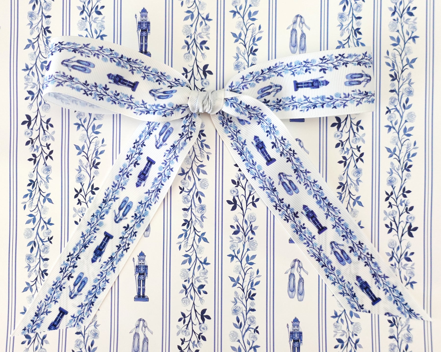 Tonal blue watercolor climbing roses dance with stripes on a white background. Add in some festive Nutcrackers & beautiful pointe shoes and you have the loveliest Christmas wrapping paper in classic blue & white!