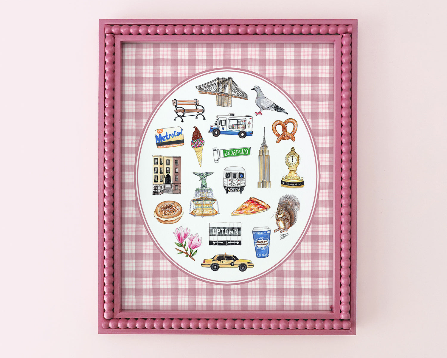 A collection of darling New York City inspired illustrations for city dwellers and New Yorkers at heart. The original illustrations were created for my annual calendar and they now live on as a beautiful homage to all things NYC! Set against a pink watercolor gingham pattern to create a lovely faux mat effect.