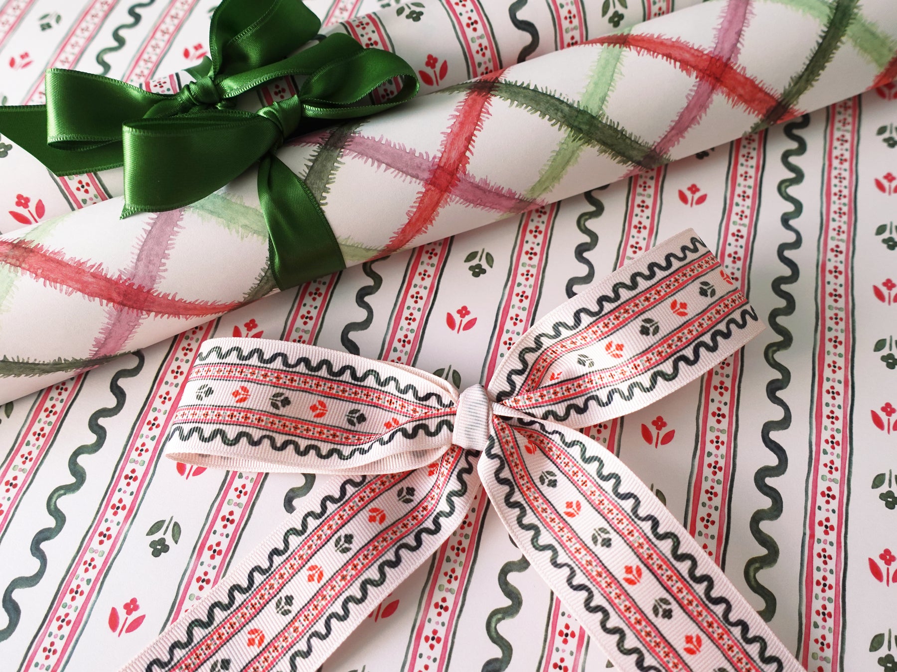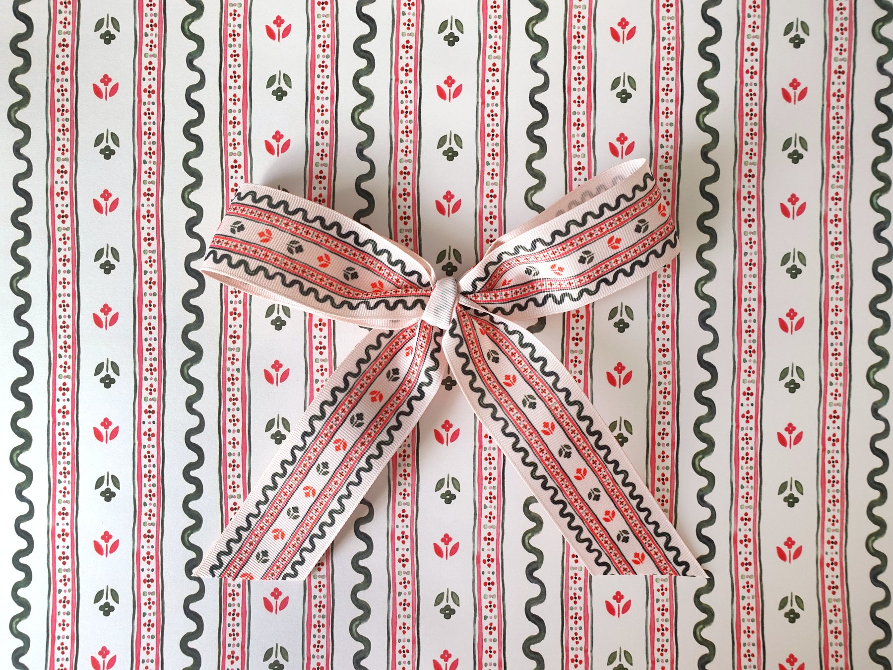 This watercolor jacquard ribbon & rick rack inspired print is a playful way to wrap your gifts in classic Christmas style!