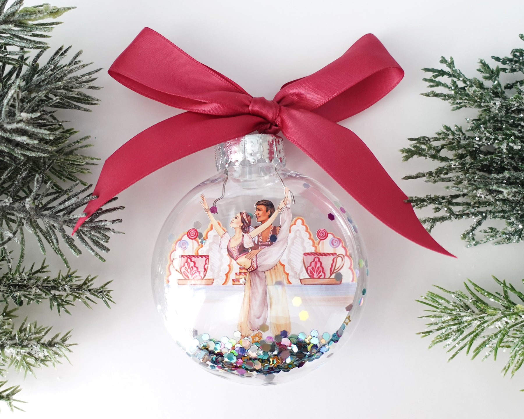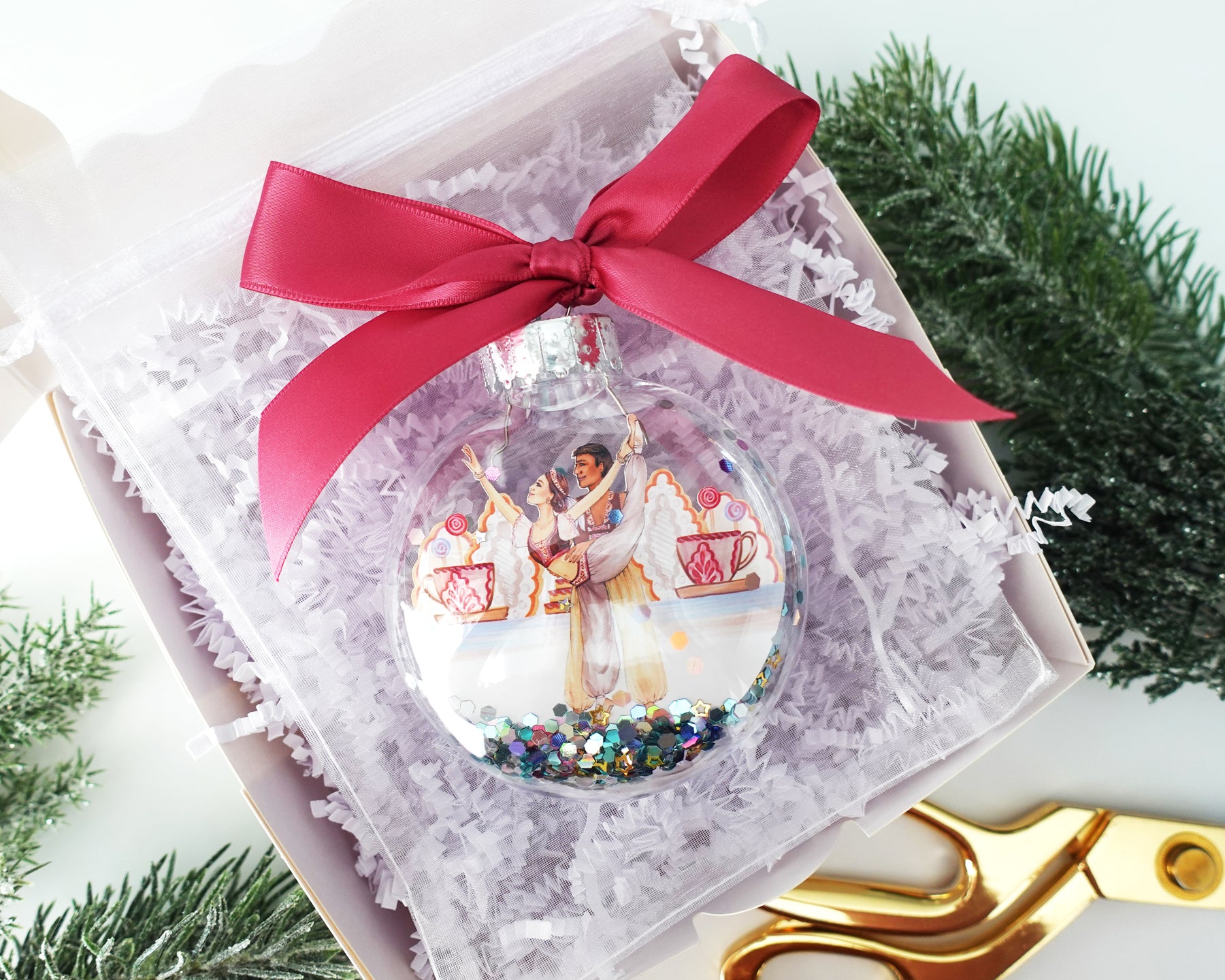 Extra glitzy and super sweet - these illustrated shatterproof ornaments are the perfect addition to your tree. This one features the Coffee duet in the Land of Sweets from the classic Nutcracker ballet. Finished with a rose pink double faced satin bow. Shake up the iridescent glitter inside for extra sparkle!